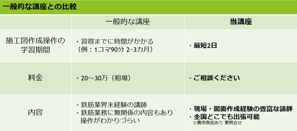 CAD操作というのは専門分野であり、一般的には専門学校に通ったり独学で学ぶ方がほとんどです。さらには、現場業務を行いながら、専門学校に通ったり独学で習得するには敷居が高く、両立するのは大変難しいと思います。そのような方々のために弊社では【初心者CAD講座】を開催しております。
